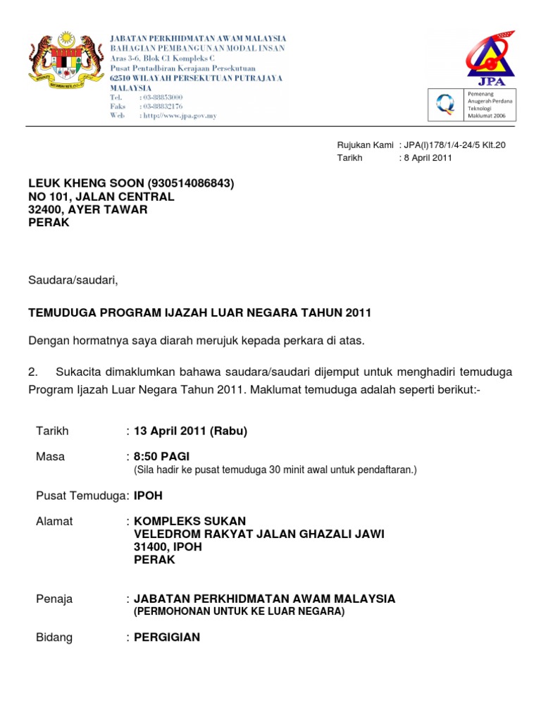 Contoh surat panggilan temuduga spa. Pastikan profil anda di SPA8i dah dikemaskini dan masih aktif. Surat Panggilan Temu Duga. Pastikan anda ada membawa bersama-sama anda surat panggilan temuduga kad pengenalan surat beranak sijil-sijil asal dokumen-dokumen asal serta surat-surat akuan asal jika ada untuk disemak oleh panel temuduga.