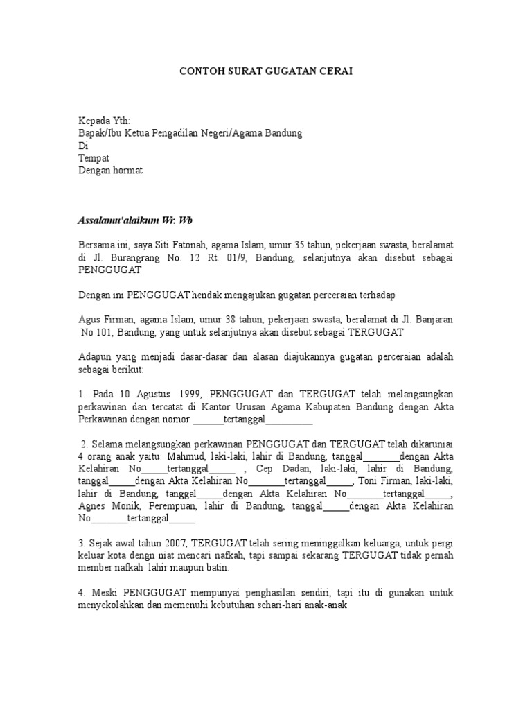 Contoh Surat Gugat Cerai Untuk Suami Perceraian Ikrar Agama