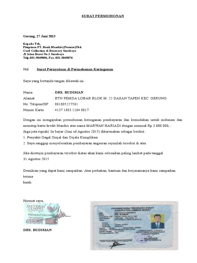 Contoh Surat Pengajuan Keringanan Pembayaran Kartu Kredit Bank Mandiri