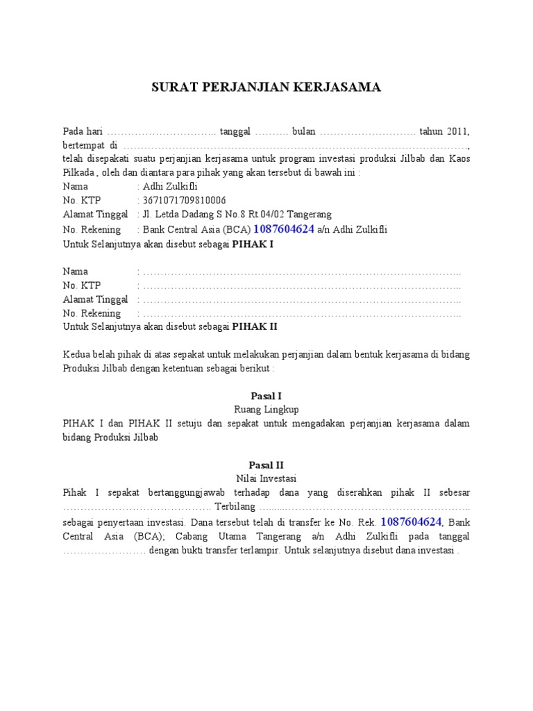 Contoh surat perjanjian kerjasama kemitraan usaha doc. Oleh pihak pertama masih belum dapat memberikan profit yang dimaksud maka pihak kedua wajib mengembalikan uang pokok investasi yaitu sebesar Rp 500000000-pada hari tersebut ditambah dengan profit bulana yang telah di sepakati. Surat Perjanjian KemitraanKerja Sama Operasi ini harus dibuat diatas kertas segel5. Seperti yang telah kami jelaskan di awal bahwa surat ini dibuat agar dijadikan sebagai bukti bahwa pihak-pihak yang bekerjasama memahami bahwa jika ia telah melakukan.