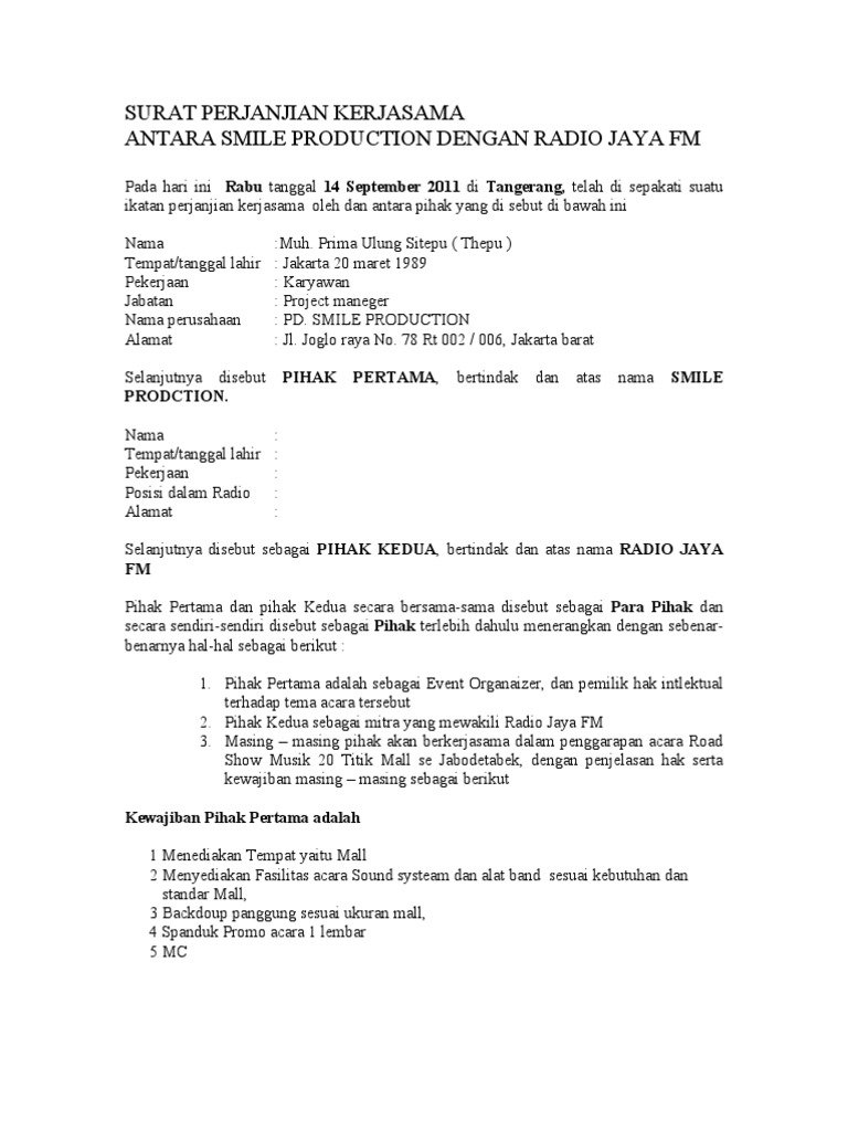 Namun untuk mengesahkan perjanjian kerjsama yang dijalani maka kedua belah pihak sebaiknya tetap menggunakan surat perjanjian kerjasama. Dalam sebuah kesepakatan baik itu dilakukan antar perorangan atau perusahaan adanya perjanjian dalam bentuk tertulis adalah hal yang utama. Contoh Surat Perjanjian Kerjasama Melakukan sebuah hubungan bisnis merupakan kegiatan dilakukan oleh kedua belah pihak bisanya salah satu pihak menjadi seorang investor atau pemodal sedangkan pihak satunya lagi merupakan pihak yg mengelola modal tersebut.
