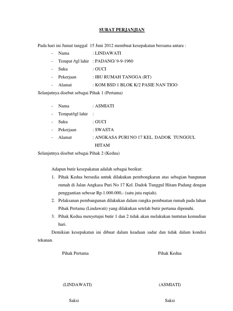 7 Contoh Surat Perjanjian Jual Beli Rumah Tanah Dan Bangunan Di 2020 Surat Tanah Pekerja Rumah Tangga. Surat perjanjian biasanya ditulis sebagai bukti bahwa telah berlangsungnya perjanjian antara pihak satu dengan pihak lainnya baik dalam melakukan kerjasama kontrak kerja penyewaan barang atau lain hal. Seperti surat pada umumnya ada beberapa spesifikasi.