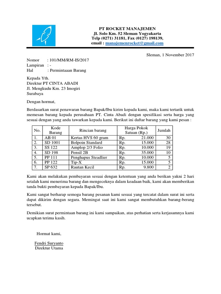 Permintaan penawaran dan daftar harga Kepada Yth. Contoh Surat Permintaan Barang yang Baik dan Benar akan berisikan secara detail isi dan maksud dari surat tersebut yakni mengenai sebuah permintaan barang lengkap dengan harga dan rincianya sehingga sangat mudah untuk di pahami kepada siapa kita akan mengirim surat juga haruslah jelas dan bisa di baca dengan sistem bahasa yang baku dan sopan. Surat pesanan barang ini termasuk ke dalam surat resmi dan seringkali dipergunakan oleh setiap perusahaan.