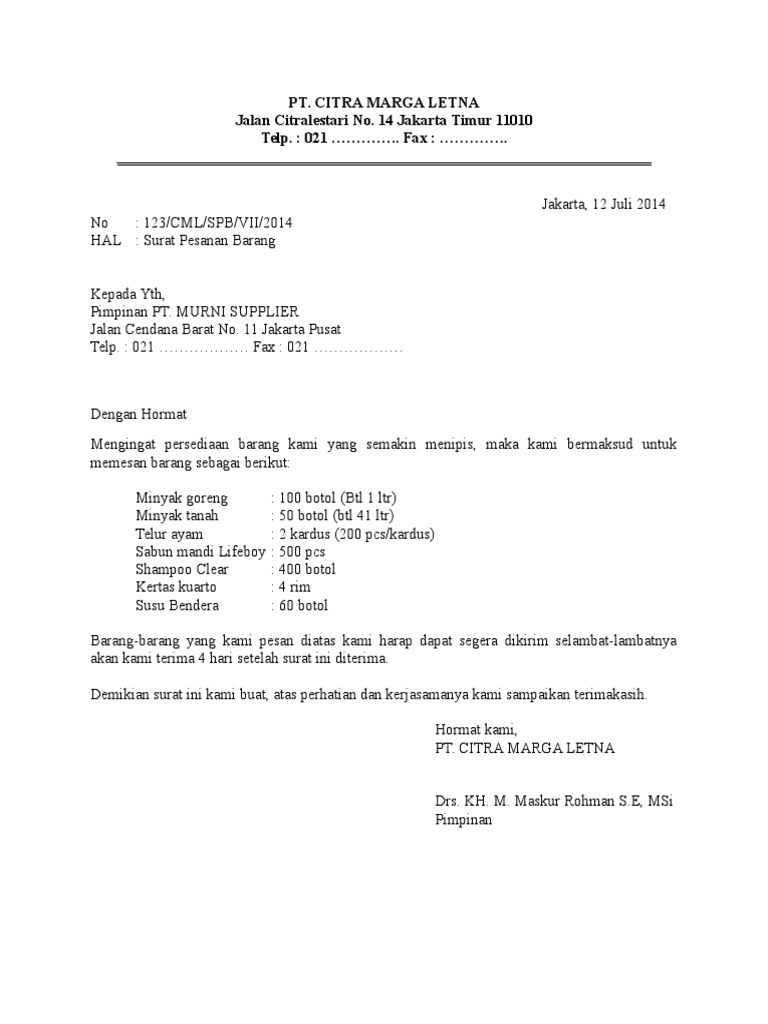 Demikian surat ini kami sampaikan untuk menjadi perhatian Saudara. Contoh Surat Pemesanan Barang - Surat pemesanan barang merupakan salah satu bentuk surat resmi yang diterbitkan oleh pembeli yang berisi tentang permintaan pembelian suatu barang tertentu yang ditujukan kepada pihak lainnya yang menjual barang baik itu perorangan maupun mewakili perusahaan. Penggunaan berbagai jenis dan contoh surat pengajuan memang sering digunakan di dunia kerja salah satunya adalah pengadaan barang.