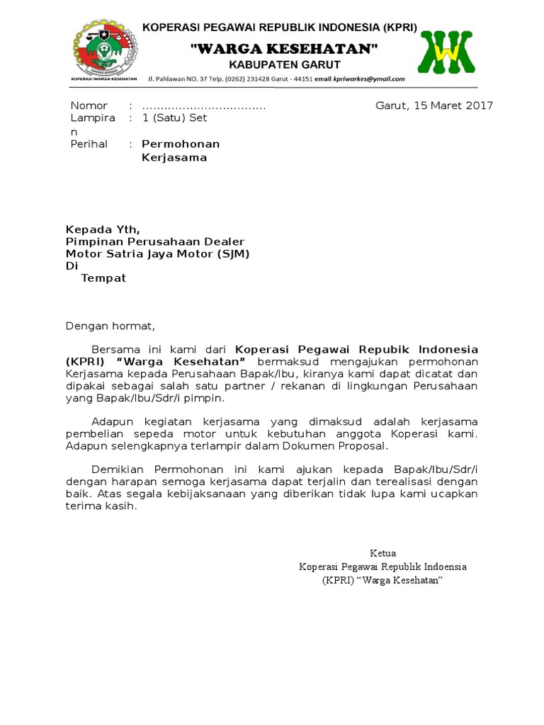 Contoh Surat Permohonan Kerjasama Koperasi Dengan Perusahaan