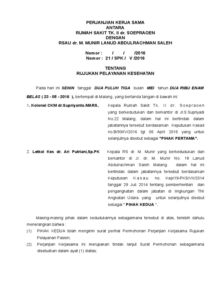 Namun ada banyak lagi surat perjanjian kerja sama yang dapat anda buat sesuai dengan kebutuhan namun agar tidak membahayakan anda sebaiknya anda memenuhi beberapa tips ini. Menjadi tanggung jawab PIHAK PERTAMA dengan rumah sakit yang bersangkutan. Kerjasama Pelayanan Kesehatan Kepada.