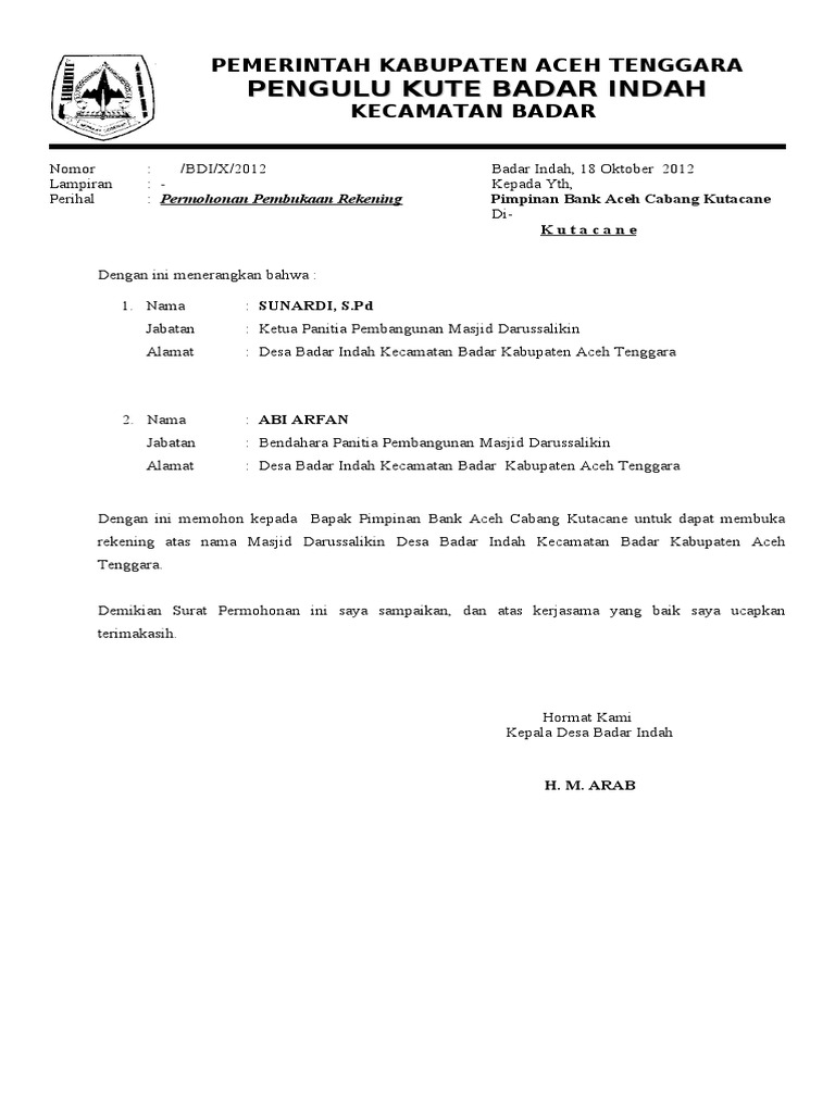 Seperti yang telah disebutkan sebelumnya surat permohonan yang memiliki format yang menjadi bukti pembuatan surat pembukaan rekening yang akan diajukan. Berikut informasi sepenuhnya tentang surat permohonan pembukaan rekening bank jatim. Untuk membuka rekening baru tersebut perlu adanya Surat Permohonan Pembukaan Rekening Bank dari Desa Gampong yang bersangkutan.