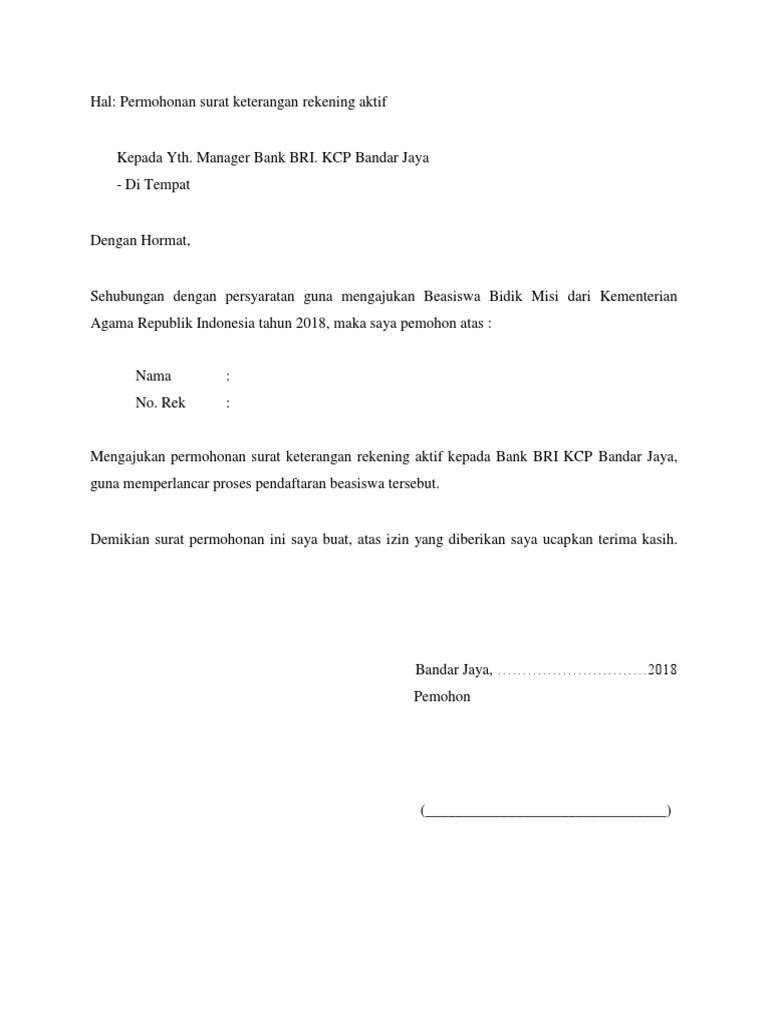 Contoh Surat Permohonan Aktif Rekening Bank