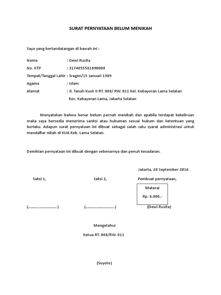 Contoh Surat Pernyataan Belum Menikah Untuk Ke Kua