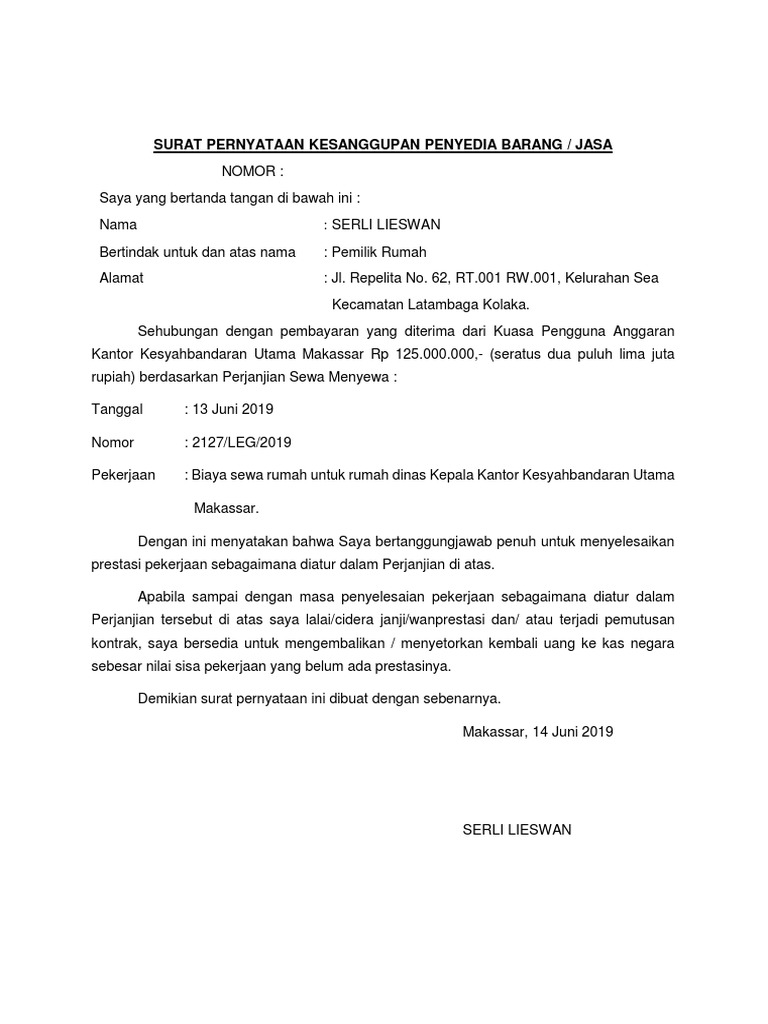 Pernyataan kesanggupan dari penyedia barangjasa untuk menyelesaikan sisa pekerjaan. Contoh Surat Pernyataan Kesanggupan Pernah ngga kamu diminta tolong sama temen untuk dibuatkan surat pernyataan kesanggupan. Penyedia Barang dan Jasa tunduk pada semua peraturan yang berlaku di Indonesia yang berhubungan dengan tetapi tidak terbatas pada penggunaan jaringan yang.