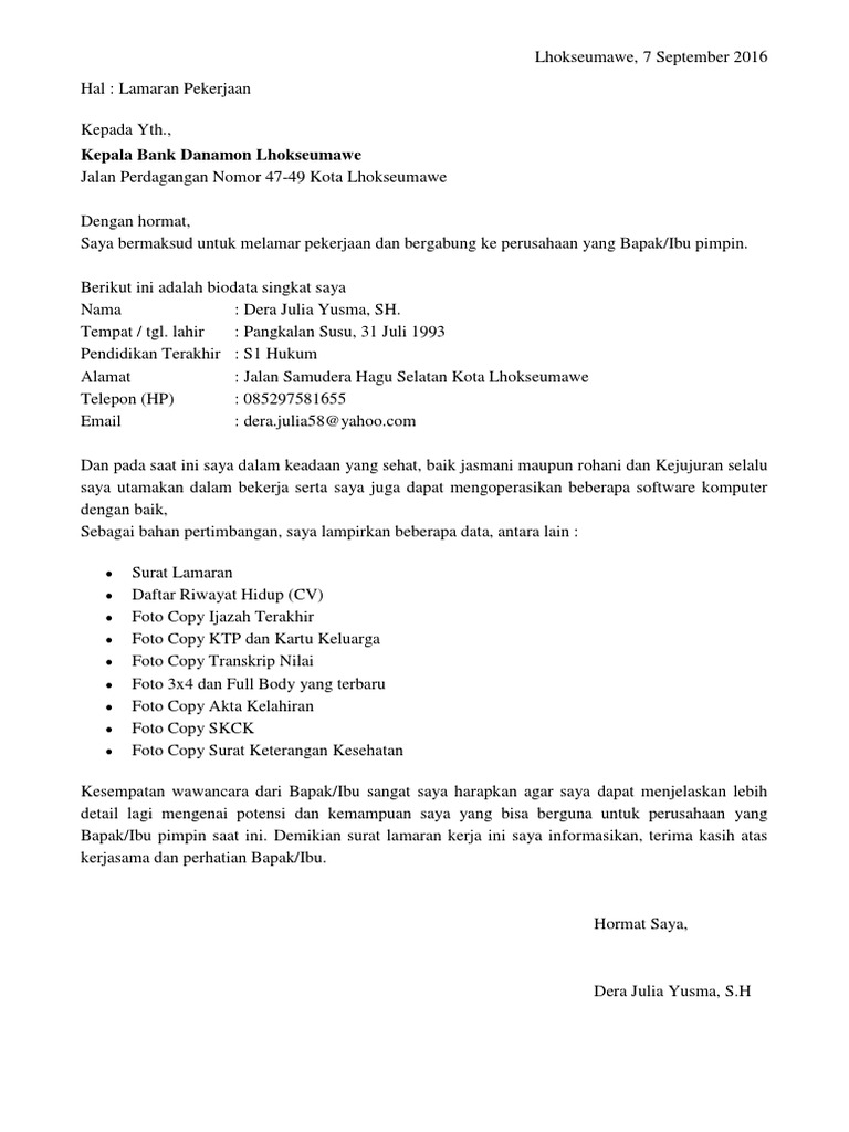Contoh surat lengkap surat ijin surat lamaran kerja perintah resmi permohonan keterangan undangan dinas niaga jalan dukungan pengantar. Melamar kerja di bank merupakan sebuah peluang karir yang menjanjikan terutama bagi Kamu yang memang kuliah di jurusan yang berkaitan dengan keuangan atau perbankan. Contoh Surat Lamaran Kerja Di Bank Danamon - Oleh karena itu anda wajib mencari referensi contoh surat lamaran kerja di bank dari.