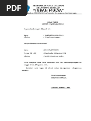 Guru sd smp sma contoh surat tugas guru untuk pembelajaran daring. BAB I PENDAHULUAN Latar Belakang Pendidikan Anak Usia Dini adalah pendidikan yang ditujukan bagi anak-anak usia prasekolah dengan tujuan agar anak dapat mengembangkan potensi-potensinya sejak dini sehingga mereka dapat berkembang secara wajar sebagai anak. Demikianlah surat tugas ini diberikan agar dapat dilaksanakan dengan sungguh sungguh dan penuh rasa tanggung jawab.