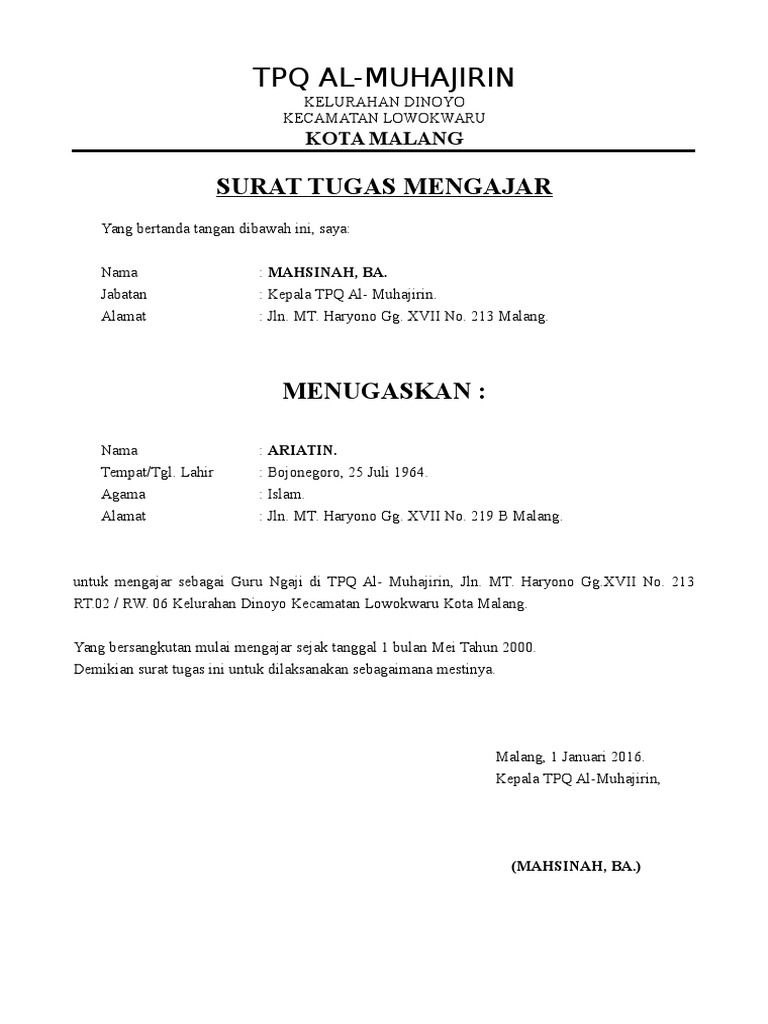 Contoh surat tugas guru tpq. Contoh Sk Guru Tpq Doc Guru Ilmu Sosial Kumpulan contoh surat keputusan sk kepala sekolah lengkap 03 feb 2016 3 comments surat keputusan atau yang biasa lebih dikenal dengan sk merupakan sebuah surat pernyataan yang dikeluarkan oleh lembaga tertentu formal maupun non formal yang berisi suatu kebijakan atau keputusan tertentu yang berhubungan. Demikianlah surat tugas ini diberikan agar dapat dilaksanakan dengan sungguh sungguh dan penuh rasa tanggung jawab. Contoh surat tugas untuk kerja dinas baik intansi pemerintahan surat tugas perjalanan dinas organisasi intansi pelatihan guru dan perusahaan pada dasarnya hampir sama dalam hal format penulisan dan hanya saja pada bagian isinya yang berbeda sedikit.