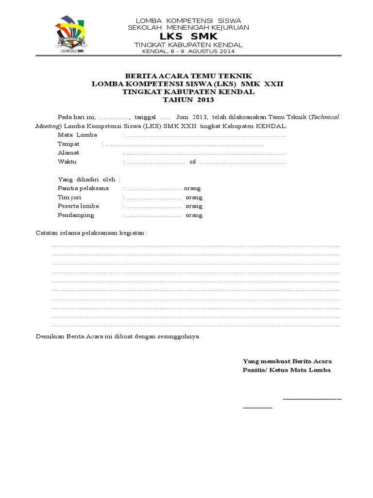 Yang mana laporan berita acara tersebut akan menjadi bukti legal berlangsungnya suatu kegiatan. Jika Anda ingin membuat laporan maka harus mengetahui bagaimana tata cara penulisannya serta format penulisan. BERITA ACARA PELAKSANAAN LOMBA KOMPETENSI SISWA TINGKAT PROPINSI TAHUN 2010.