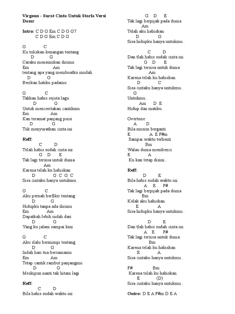 Virgoun Surat Cinta Untuk Starla Intro C D G Em C D G G7 C D G Em C D G G C Ku tuliskan kenangan tentang D G Caraku menemukan dirimu Em Am tentang apa yang membuatku mudah D G Berikan hatiku padamu G C Takkan habis sejuta lagu D G Untuk menceritakan cantikmu Em Am Kan teramat panjang puisi D G Tuk menyuratkan cinta ini Chorus C D Telah. Kunci Gitar Balasan Surat Cinta Untuk Starla - Lian Karoho Ryo Kreepeek R-Ffley Endha Chakz Transpose. Jadi untuk sobat yang mencari lagunya di youtube mungkin beberapa kali akan tersesat dengan pembuat judul hoax.