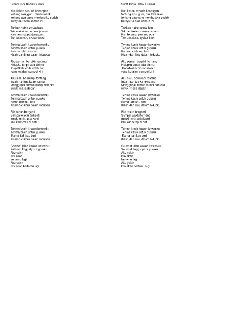 Lirik lagu surat cinta untuk guru. Lagu Surat Cinta Untuk Starla yang diciptakan Virgoun pada awal tahun 2016 sebenarnya ditujukan untuk anaknya yang bernama Starla sebagai ungkapan rasa kasih sayang kepadanya. Admin blog Seputaran Guru 2019 juga mengumpulkan gambar-gambar lainnya terkait lirik lagu surat cinta untuk seorang guru dibawah ini. 17 Juni 2015 1651 49158 1 1 Mohon Tunggu.