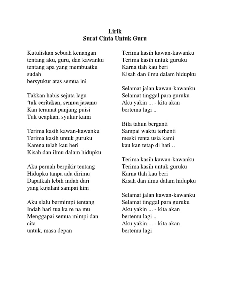 Lirik lagu surat cinta untuk guru mp3. Lirik Lagu Surat Cinta Untuk Guru ini merupakan koleksi lirik terbaru 2018 dari KITAB LIRIK LAGU. Like subscribe coment and share. Lagu Surat Cinta Untuk StarlaMP3 bisa didengarkan di aplikasi YouTube Music di bawah ini.