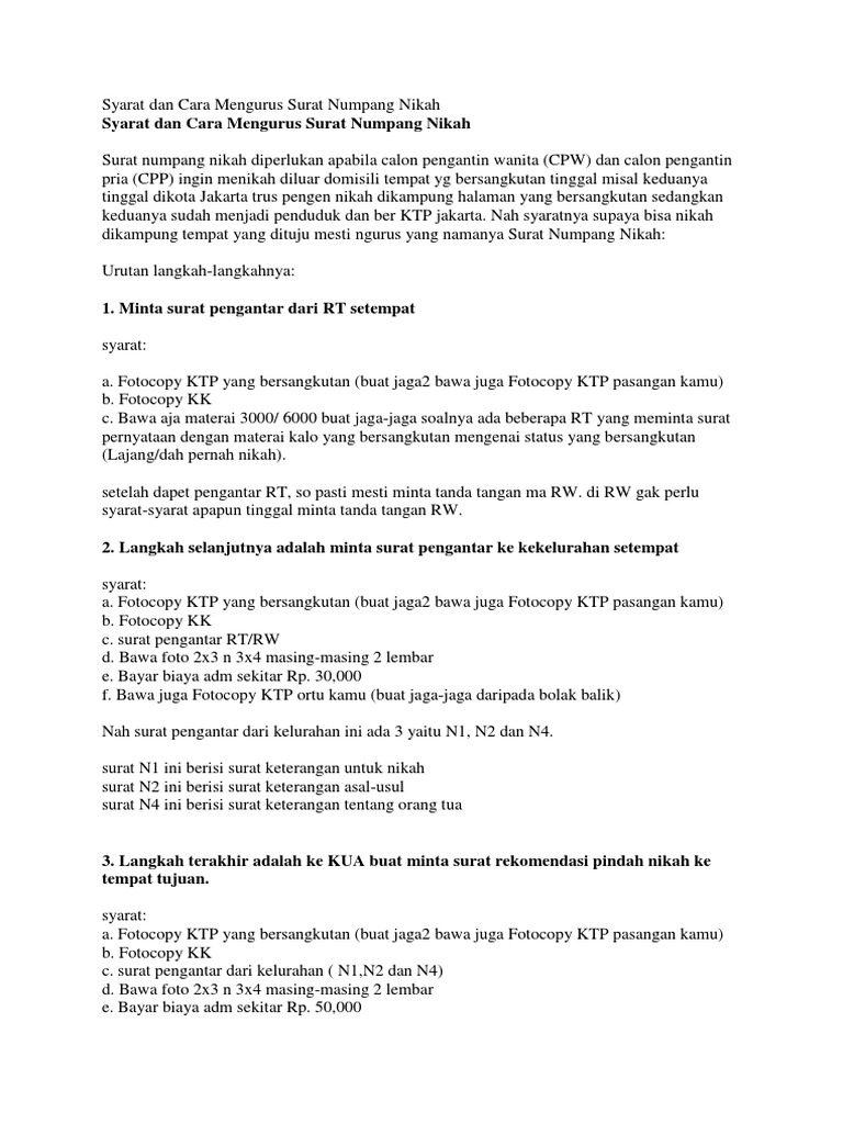 Mengurus surat numpang nikah di kelurahan. Dari penjelasan di atas sebenarnya sudah sedikit menjelaskan tentang proses pembuatan surat keterangan numpang nikah. Meminta surat pengantar nikah dari RTRW Calon pengantin pria CPP dan calon pengantin wanita CPW masing-masing mengurus surat pengantar nikah. Foto copy KTP dan Kartu keluarga.