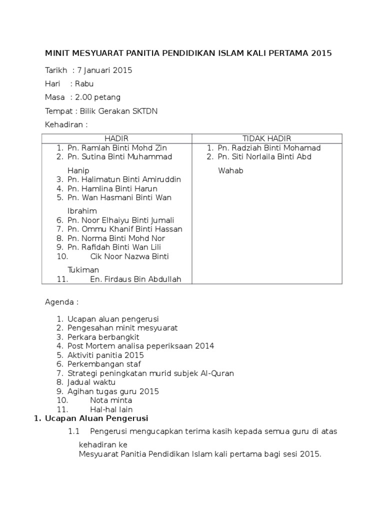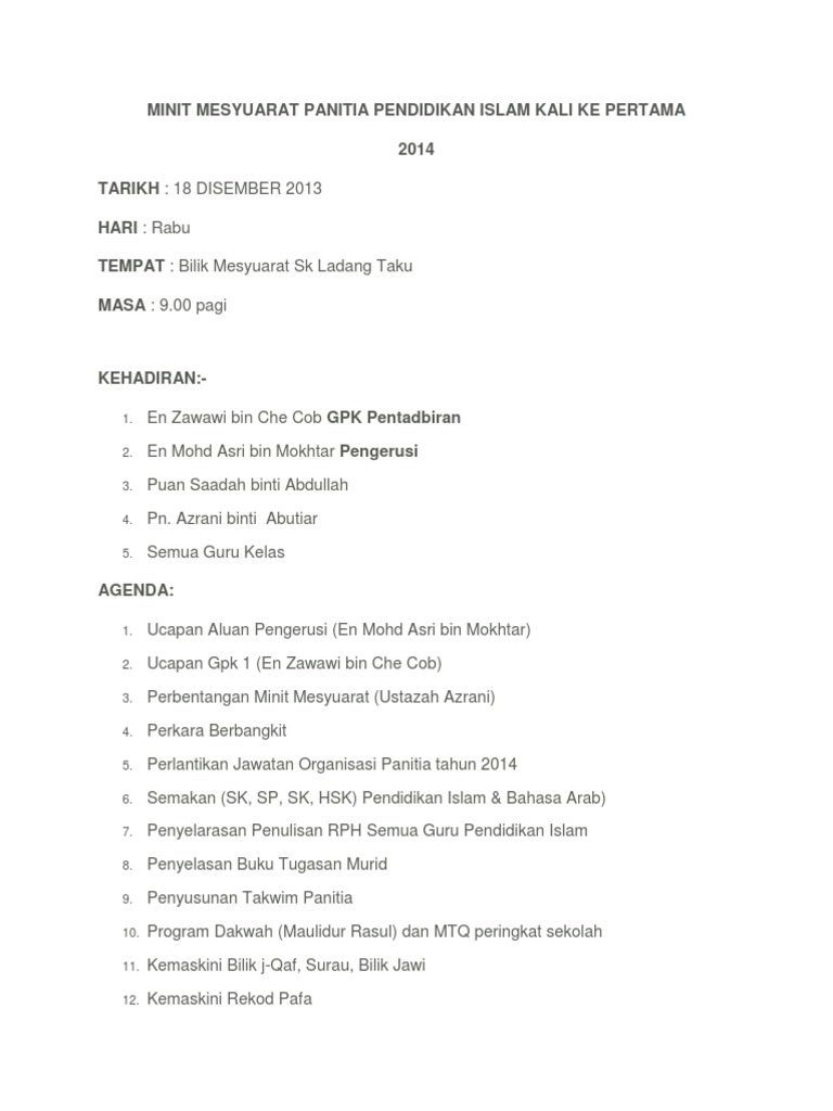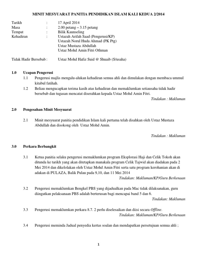 Minit mesyuarat panitia pendidikan islam kali pertama 2020. En zool ikhsan bin mohd zain 3. Mengucapkan terima kasih kepada semua guru yang hadir. Berikut merupakan koleksi minit mesyuarat panitia pendidikan islaml bagi kali yang pertama kedua ketiga dan keempat.