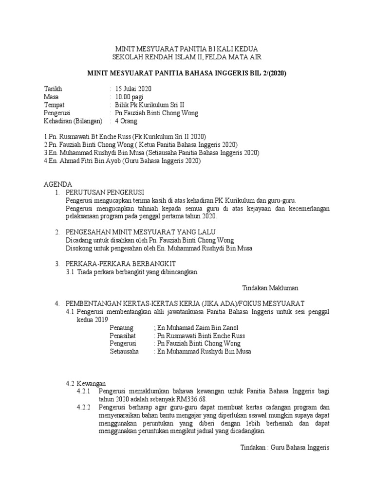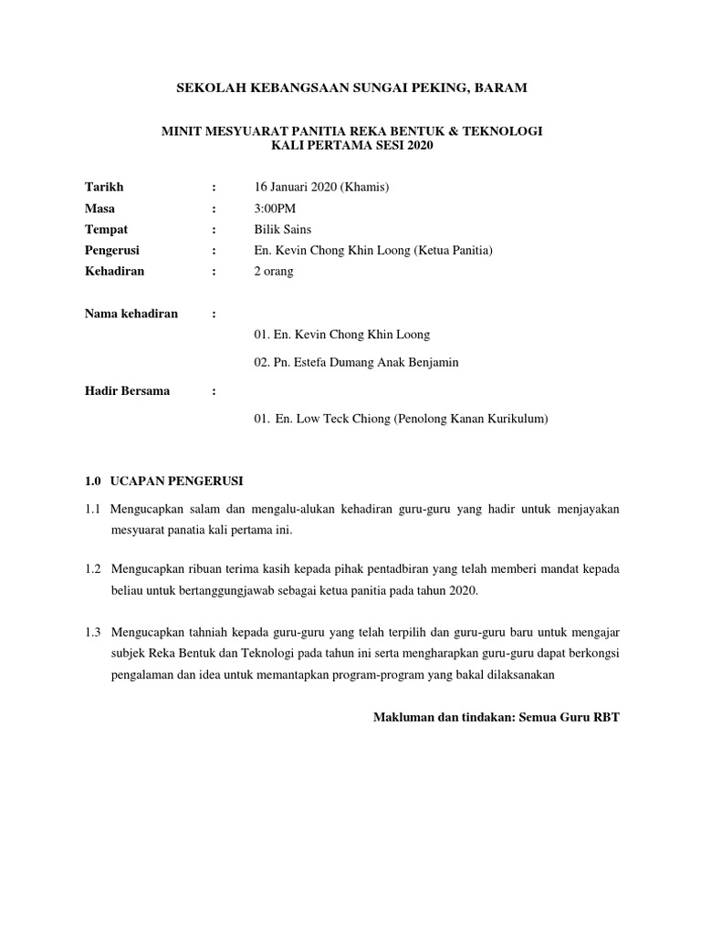 New zealand 26500 maran pahang tarikh. Pengesahan minit mesyuarat lalu 3. Contoh Minit Mesyuarat UBK Kali 1.