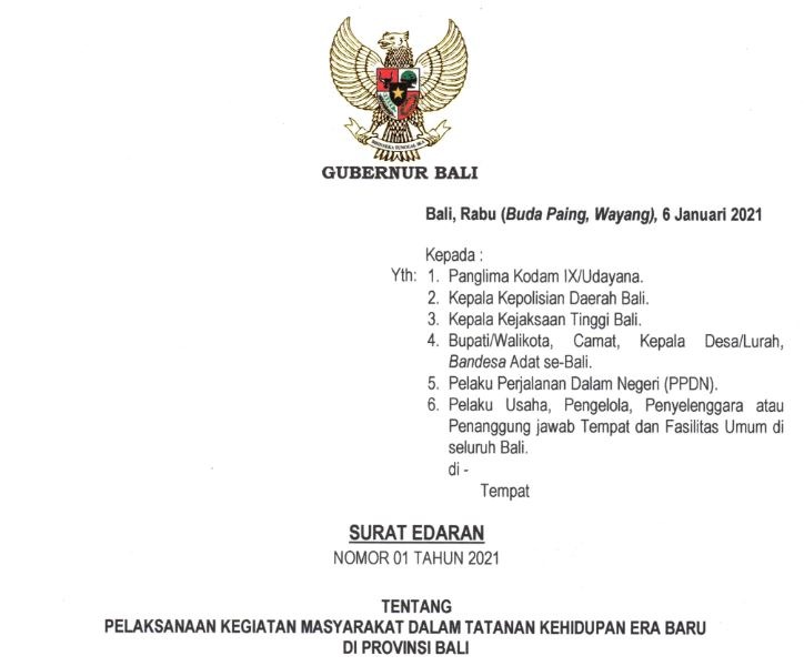 Surat Edaran Gubemur Bali Nomor 3355 Tahun 2020 tentang Protokol Tatanan Kehidupan Era Baru. Gubernur Bali mengeluarkan Surat Edaran SE. Mengawali tahun 2021 Gubernur Bali kembali mengeluarkan Surat Edaran Nomor 01 Tahun 2021 pada tanggal 6 Januari 2021 tentang Pelaksanaan Kegiatan Masyarakat dalam Tatanan Kehidupan Era Baru di Provinsi Bali.