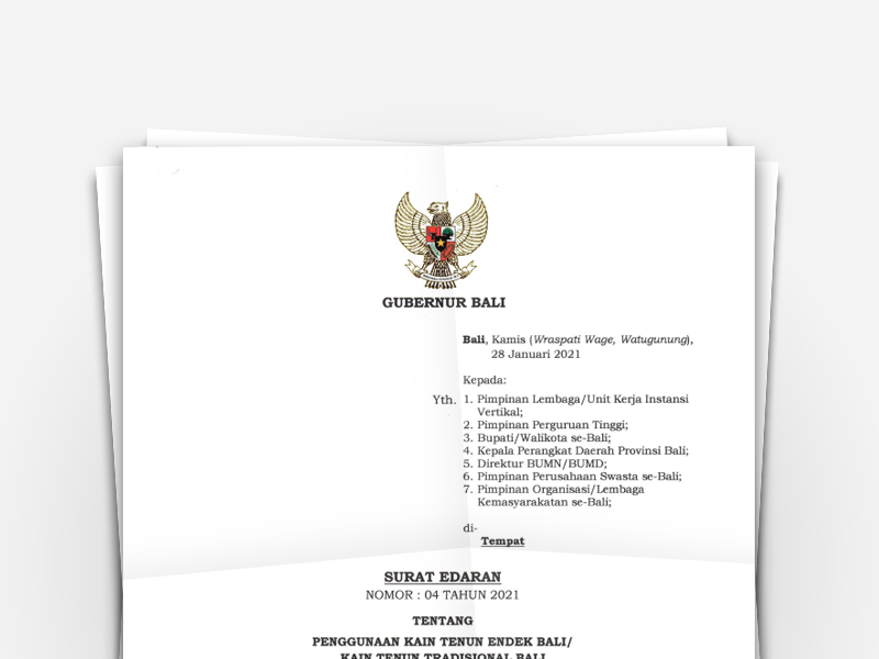 Surat edaran gubernur bali nomor 2 tahun 2021. Dan Peraturan Gubernur Bali Nomor 99 Tahun 2018 tentang Pemasaran dan Pemanfaatan Produk Pertanian Perikanan dan Industri Lokal Bali. Kepada BupatiWalikota Camat Kepala DesaLurah Bandesa Adat se-Bali serta para pihak terkait agar. Edaran yang berpihak kepada industri tenun lokal Bali ini langsung disambut positif oleh seluruh Forum Komunikasi.
