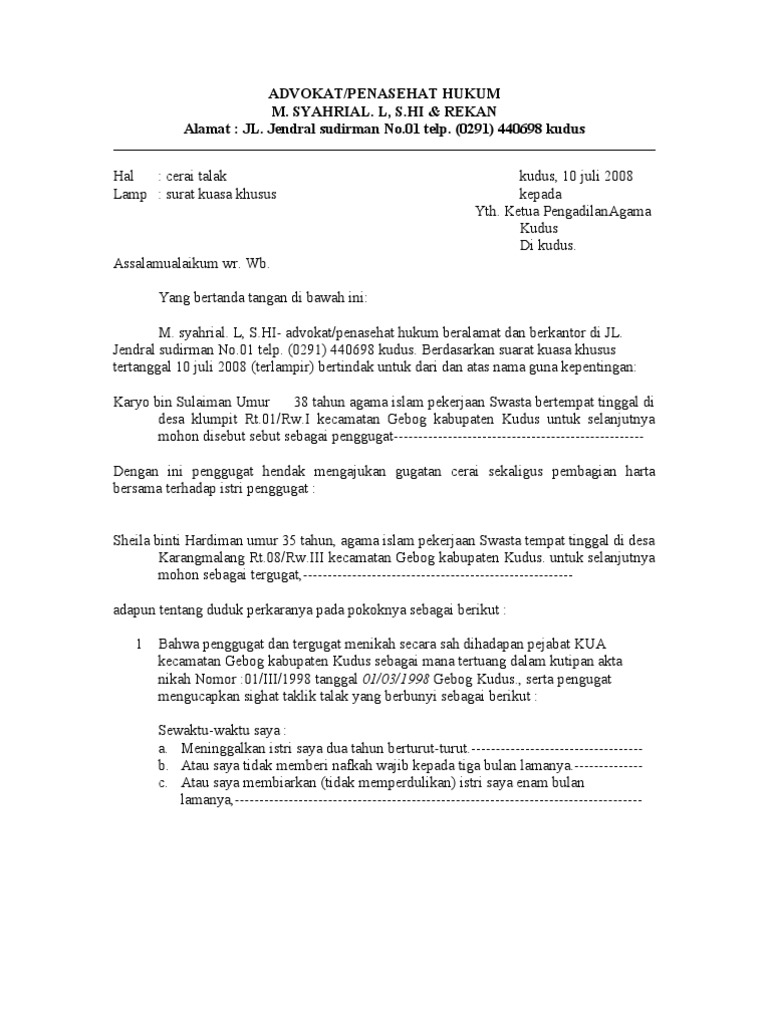 Surat gugatan cerai online. Surat Gugatan Cerai Alamat Email sangat direkomendasikan menggunakan Gmail Saat ini memang sudah ada aplikasi E-Court yang diluncurkan oleh Mahkamah Agung namun untuk bisa mendaftar baik yang menggunakan kuasa hukum maupun yang tanpa kuasa hukum pendaftaran masih harus dibantu oleh petugas pengadilan karena aplikasi tersebut masih dalam. Contoh Surat Kuasa Gugatan Cerai have an image associated with the otherContoh Surat Kuasa Gugatan Cerai It also will feature a picture of a sort that could be seen in the gallery of Contoh Surat Kuasa Gugatan Cerai. Perlu diketahui pihak yang mengajukan gugatan disebut sebagai penggugat.