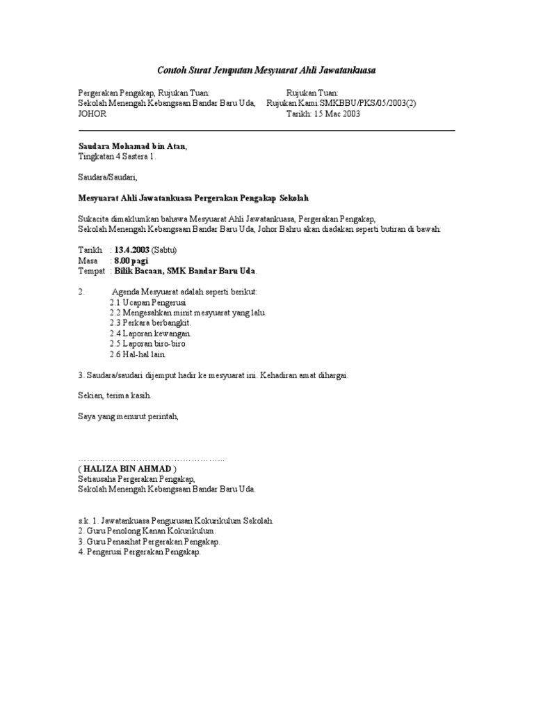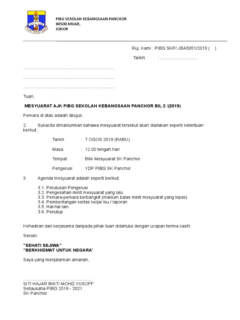 Surat jemputan mesyuarat ajk pibg. Surat Rasmi Jemputan Mesyuarat Surat Ras. 085 - 736197 E-mel. Sebagai setiausaha pibg pelbagai surat perlu dibuatsempena mesyuarat agung pibg yang akan diadakan pada hujung bulan ni cn sukacita berkongsi dengan anda contoh surat jemputan sebagai perasmi untuk mesyuarat agung tersebut.