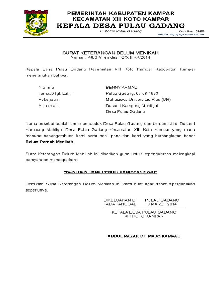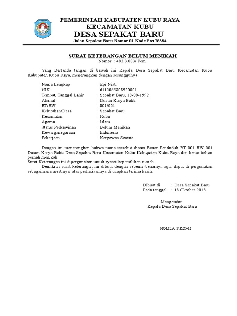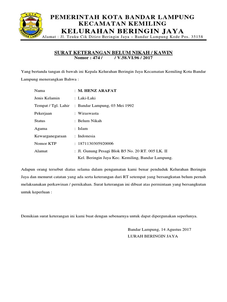 Admin blog Bagikan Contoh 2019 juga mengumpulkan gambar-gambar lainnya terkait surat keterangan belum menikah dari kelurahan doc dibawah ini. Keyword surat keterangan belum menikah online contoh surat keterangan belum menikah pdf contoh surat keterangan belum menikah dari rt masa berlaku surat keterangan belum menikah fungsi surat keterangan belum menikah surat keterangan belum menikah surabaya surat keterangan belum. Surat keterangan belum menikah adalah surat yang ditulis yang mana digunakan untuk menerangkan bahwasannya seseorang belum menikah.