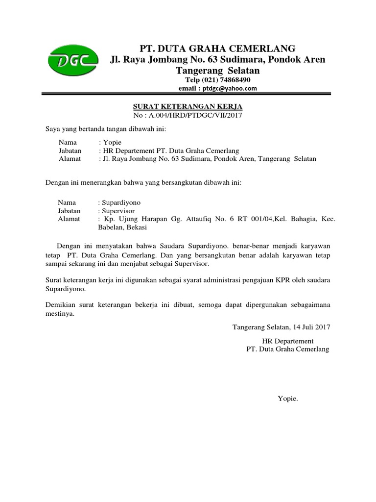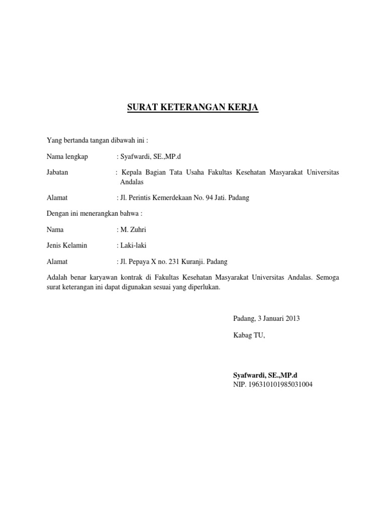 Surat keterangan kerja karyawan kontrak. Isi surat Isi Surat Keterangan Karyawan biasanya menjelaskan beberapa poin seperti periode atau masa kerja orang yang bersangkutan serta tujuan pembuatan surat. Karyawan paruh waktu dan karyawan kontrak. Contoh surat keterangan kerja Surat Keterangan kerja di gunakan karyawan atau seseorang yang memiliki ikatan kerja untuk memberikan penjelasan atau informasi bahwasanya dia adalah sebagai pekerja dan sedang bekerja dengan ini dia akan mendapatkan sebuah konfirmasi baik terhadap orang yang bersangkutan dengan dia.