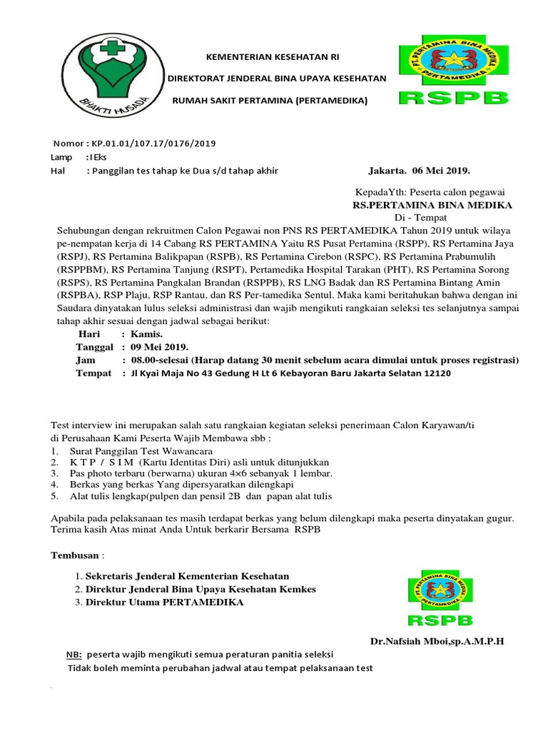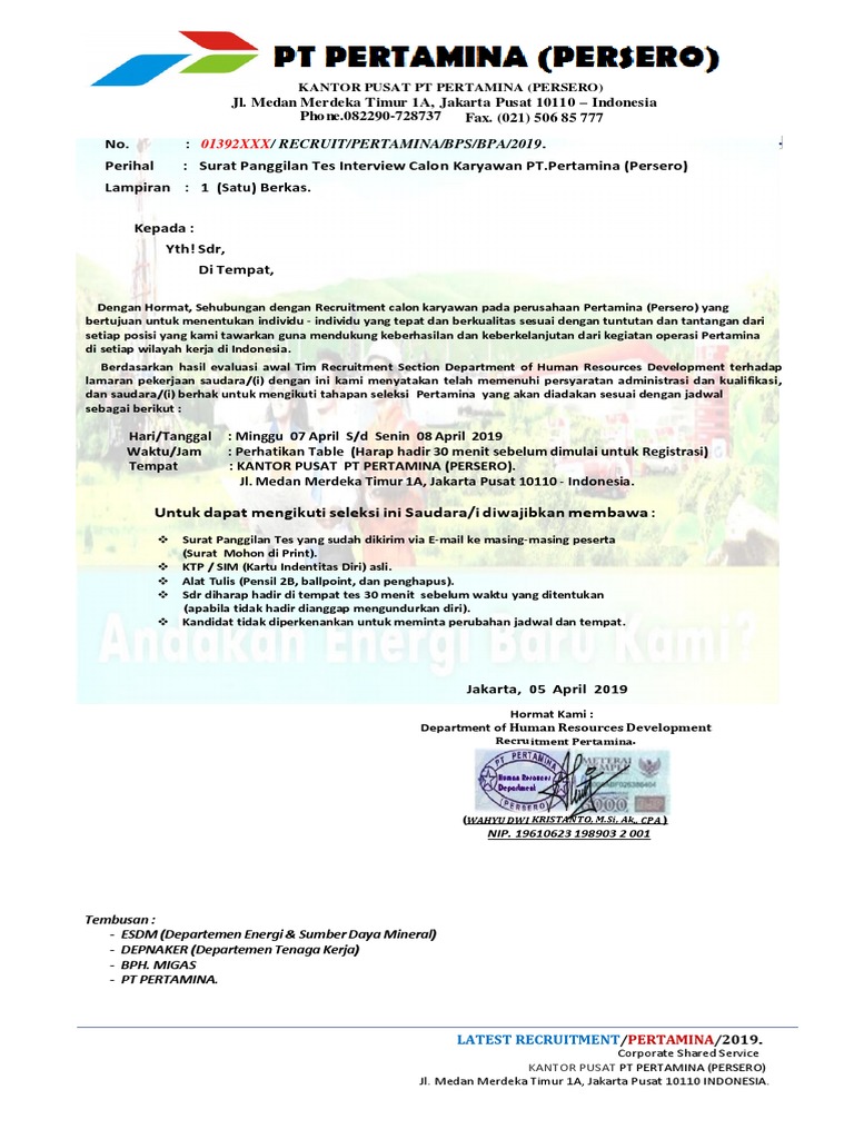 Surat panggilan tes dari ptpertamina ke jakarta. Gaji yang tinggi menjadi alasan utama untuk masuk dan bekerja di Pertamina. Telah beredar surat panggilan kerja mengatasnamakan PT Pertamina untuk wilayah Daerah Istimewa Yogyakarta dan Surakarta.