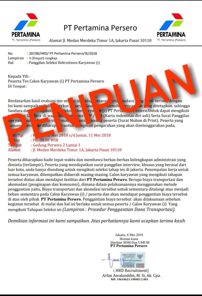 Pertamina Persero Unit Pemasaran Pekanbaru Jl. Tiga lembar surat palsu ini dikeluarkan di Jakarta pada 4 Maret 2019 lalu. Surat yang diberi nomor 816SDM-317042020 itu berisi enam lampiran yang tertulis untuk kepentingan panggilan tes seleksi rekrutmen karyawan PT Pertamina Persero.