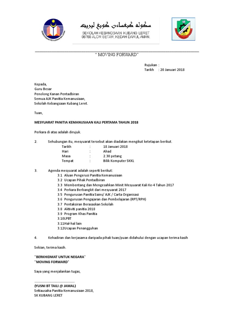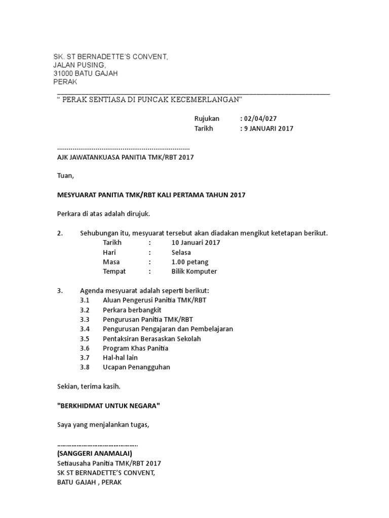Surat panggilan mesyuarat panitia sains kali pertama. Mohd faizal bin ali ajk pn. Surat panggilan mesyuarat minit mesyuarat 1. Ucapan Pengerusi 11 Memulakan majlis dengan ucapan salam.