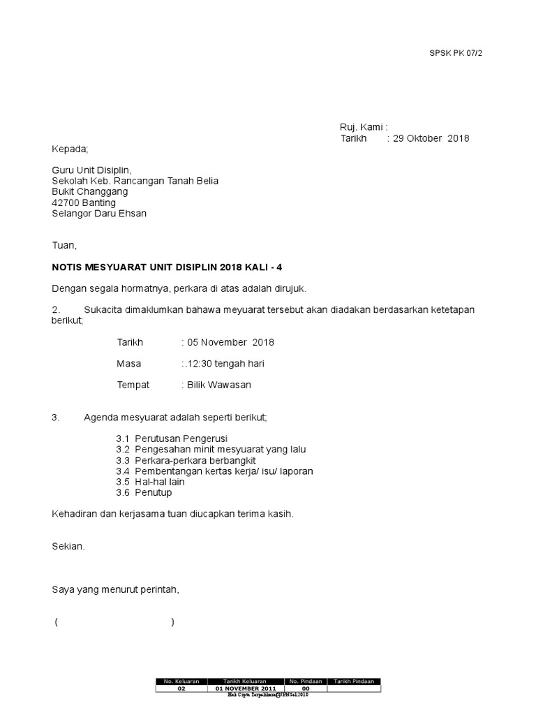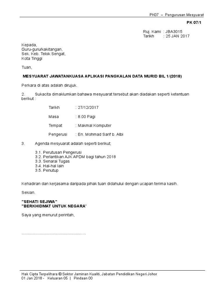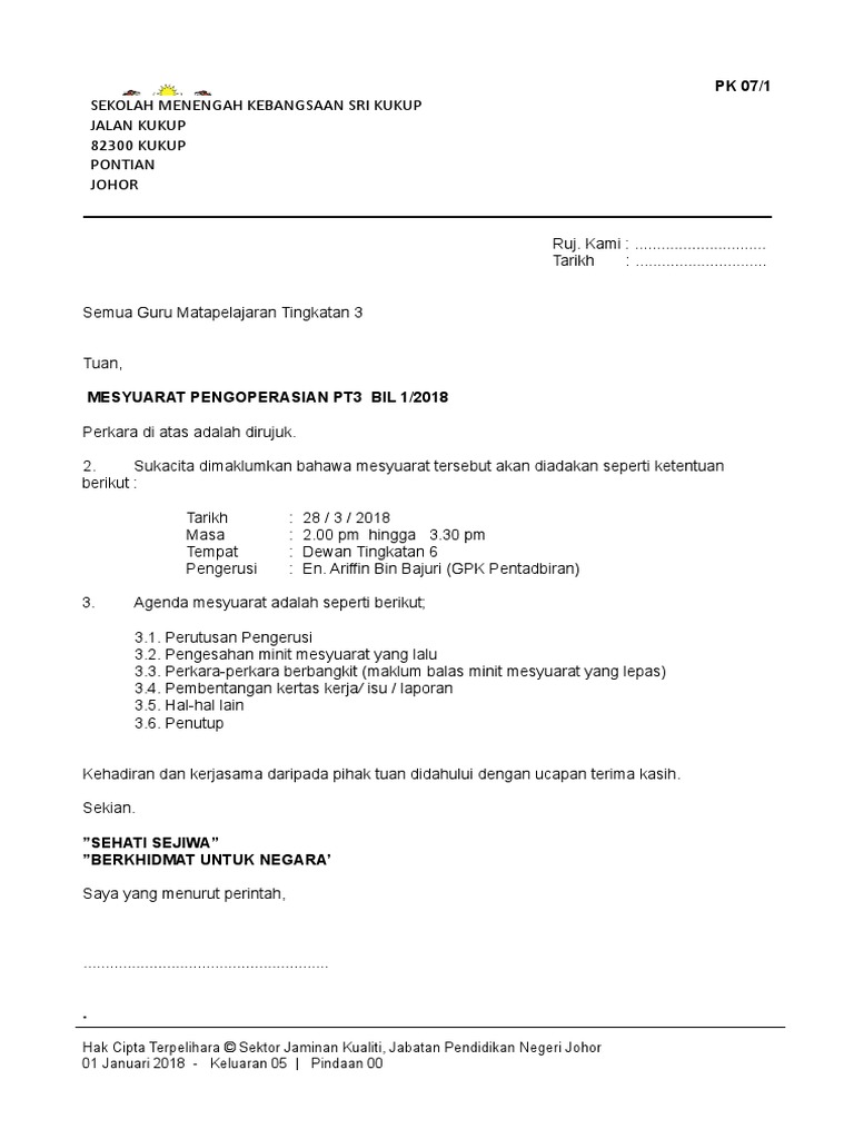 Surat panggilan mesyuarat spsk 2018. Semua staf dan AKP Tuan JEMPUTAN MESYUARAT PENGURUSAN SEKOLAH BILANGAN 2 TAHUN 2018 Dengan segala hormatnya perkara di atas adalah dirujuk. JADUAL DI BAWAH MENUNJUKKAN NAMA KANDUNGAN DAN JENIS FAIL PANITIA. View SPSK PK07 CONTOH SURAT PANGGILAN MESYUARAT newdoc from SAP TECHNOLOGY at Cambridge.