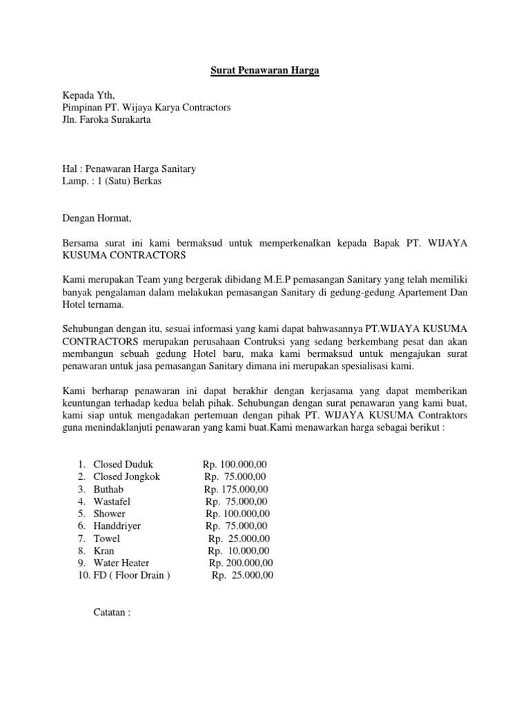 Surat penawaran harga pengurugan tanah. Menentukan harga jual jajanan gerobak. Perumahan Bukit Wahid Regency. Kami berharap melalui surat penawaran ini dapat terjalin kerjasama yang baik dan menguntungkan kedua belah pihak.