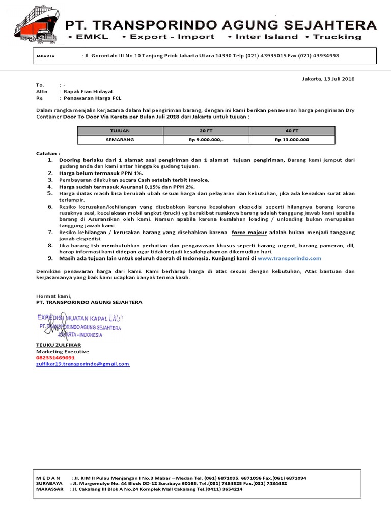 Nah jika tidak ingin melakukan kesalahan dalam membuatnya maka wajib hukumnya untuk memperhatikan beberapa contoh surat penawaran yang sudah ada. 11 Contoh Surat Penawaran Barang Jasa Kerjasama Pesanan Penawaran Kerjasama Mitra Agen Pengiriman Barang Kaskus Mengenal Sedikit Mengenai Perusahaan Jasa Pengiriman Barang Contoh Proposal Usaha Pengiriman Paket Aplikasi Pengiriman Logistik Nct Cargo Dan Ekspedisi Contoh Proposal Ekspedisi Pengiriman Barang Foreign Trade. Hormat Kami Marketing Manajer.