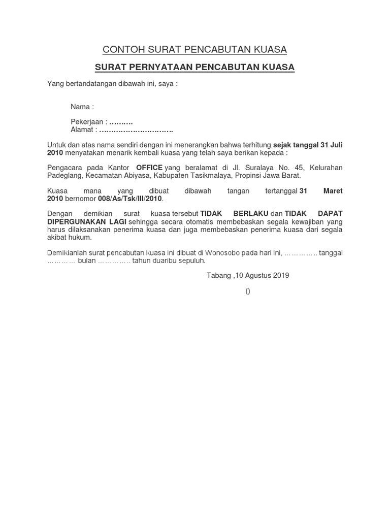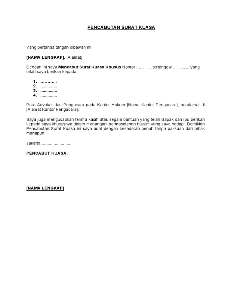 Imagescontoh Pencabutan Surat Kuasa. Dengan pencabutan Surat Kuasa tersebut maka Surat Kuasa tersebut dinyatakan tidak berlaku dan tidak dapat dipergunakan lagi. Pencabutan gugatan atas perkara yang belum diperiksa dilakukan dengan surat.