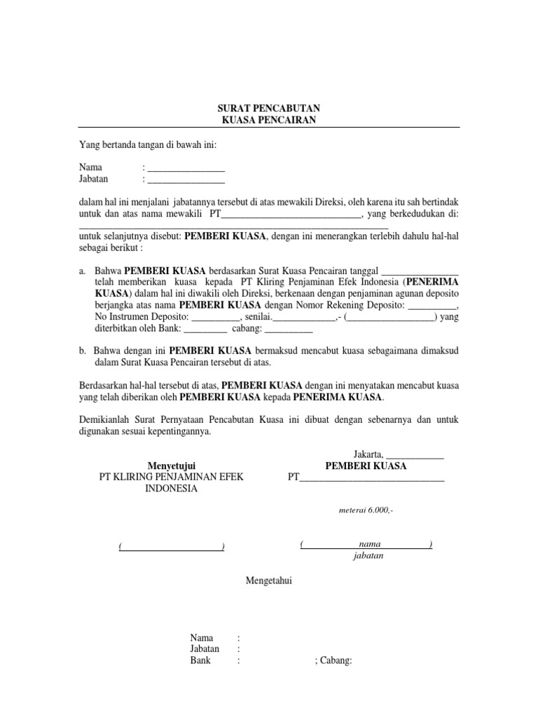 Surat pencabutan kuasa in english. Surat pencabutan kuasa atas penggunaan kartu kredit bank oleh instansi swasta. Demikianlah pencabutan Surat Kuasa ini saya buat dalam keadaan sehat dan sadar tanpa adanya tekanan maupun paksaan dari pihak mana pun dan untuk digunakan sebagaimana mestinya. Nah oleh karena itu pada kesempatan kali ini kita akan bersama-sama membahas dan.