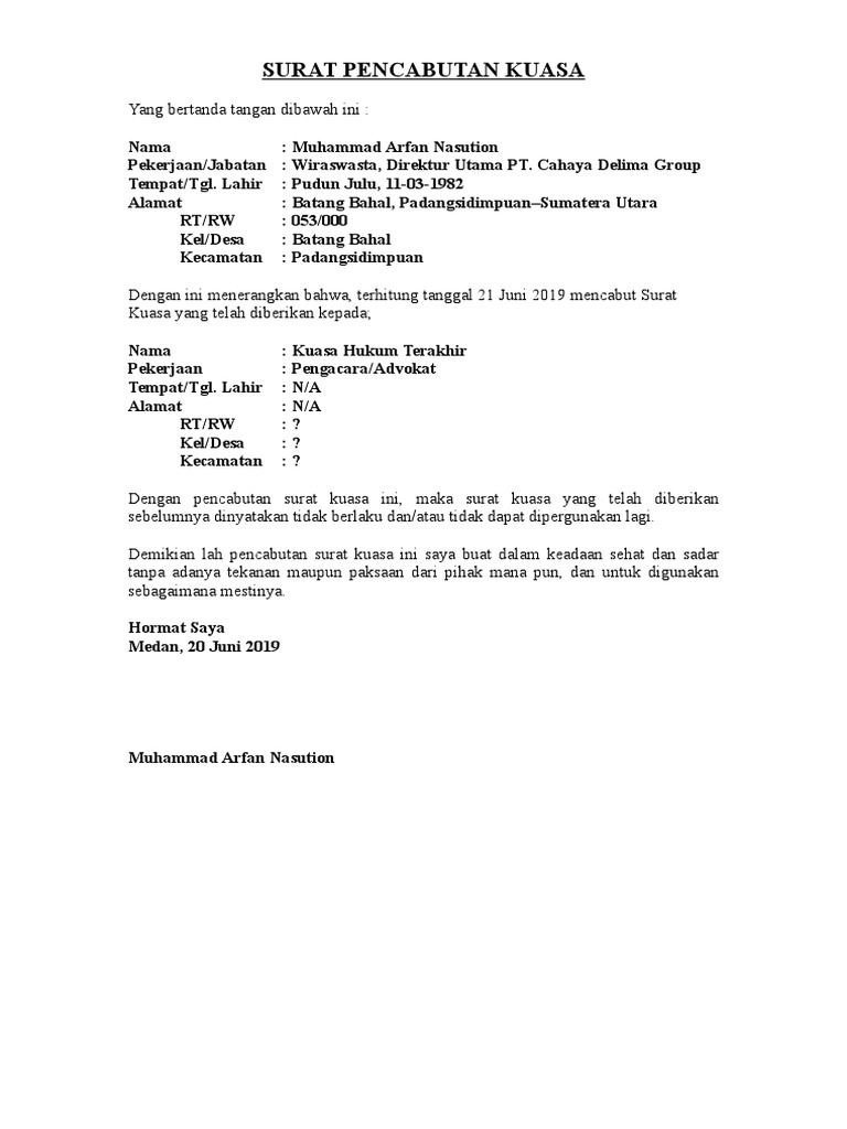 Surat Pencabutan Kuasa In English