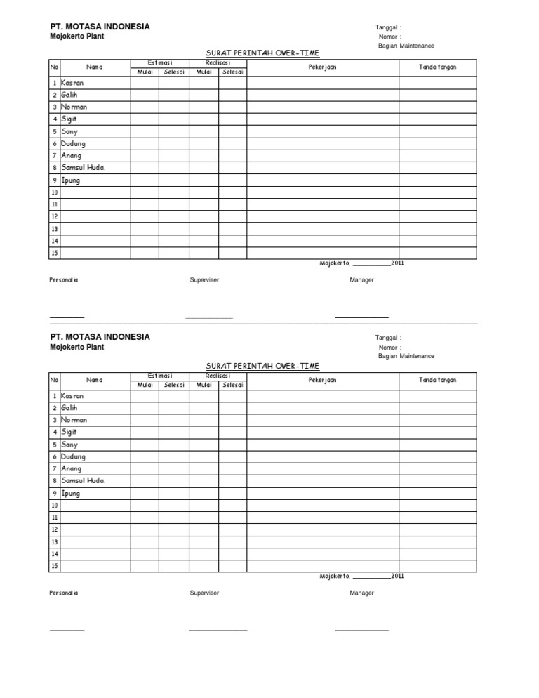 Surat perintah kerja lemburdoc. Pengawas Spv Atasan HRD Finance SURAT PERINTAH LEMBUR Hari Tanggal SPL. Perintah tertulis dan persetujuan tertulis sebagaimana dimaksud dalam ayat 1 dapat dibuat dalam bentuk daftar pekerjaburuh yang bersedia bekerja lembur yang ditandatangani oleh pekerjaburuh yang bersangkutan dan pengusaha. Demikian surat perintah kerja ini diperbuat untuk bisa dilaksanakan sebagaimana mestinya.