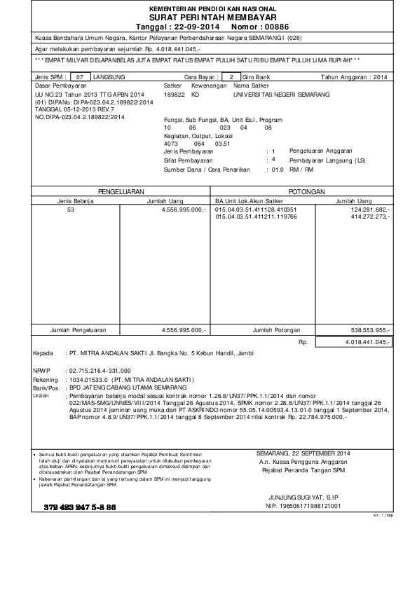 Surat perintah membayar langsung. Surat Perintah Pencairan Dana meliputi SP2D gaji bulanan yang mencakup pembayaran gaji bulanan termasuk di dalamnya gaji terusan dan gaji ke-13 dan SP2D non gaji bulanan yang mencakup pembayaran gaji bulanan termasuk kekurangan gaji dan gaji susulan uang persediaan dana Perhitungan Fihak Ketiga PFK serta pembayaran pinjamanhibah luar. Sumber Daya Ilmu Pengetahuan dan Teknologi. Surat Pertanggungjawaban Pengguna Anggaran 3.