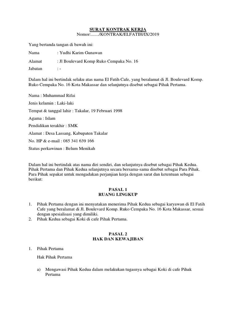 Apabila salah satu pihak ingin memutuskan perjanjian kerja sebelum berakhir waktu perjanjian maka pihak yang akan memutuskan perjanjian kerja wajib memberitahukan secara tertulis 1 bulan sebelumnya dan berkewajiban bagi pihak yang memutuskan untuk menyampaikan alasan yang rasional dan berupaya seminimal mungkin tidak merugikan pihak lainnya 3. Kapan surat ini dibuat. Dalam hal ini bertindak untuk dan atas nama Sandys Cafe yang selanjutnya disebut Pihak Pertama Pihak kedua Nama.
