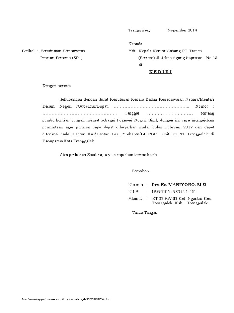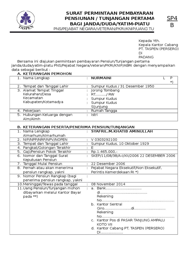 Surat permintaan pembayaran pensiun pertama. YANG MENGALAMI KEJADIAN Nama Lahir Tanggal Bulan Tahun Tanggal Kejadian Tanggal Bulan Tahun NIPNIKNRPNPV. Daftar Riwayat Kepangkatan dari ybs. PENSIUN PERTAMA DAN TABUNGAN HARI TUA SP4A DAN THT Apabila peserta berhenti dengan mendapat hak pensiun Mengisi formulir Permintaan Pembayaran FPP.