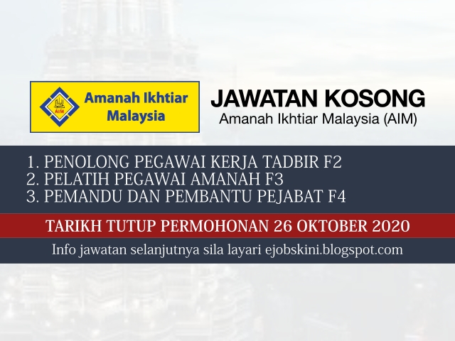 Iklan Jawatan Kosong Kerajaan Terkini Amanah Ikhtiar Malaysia AIM Terkini 2020 - Tempoh sah laku permohonan Jawatan Kosong AIM Januari Mac November Jun 2020. 3 Jalan Cempaka SD121A Bandar Sri Damansara PJU9 52200 Kuala Lumpur Tel. Jawatan Kosong Amanah Ikhtiar Malaysia AIM.