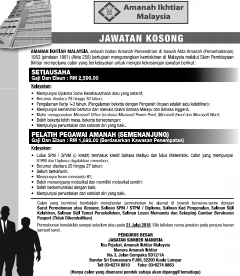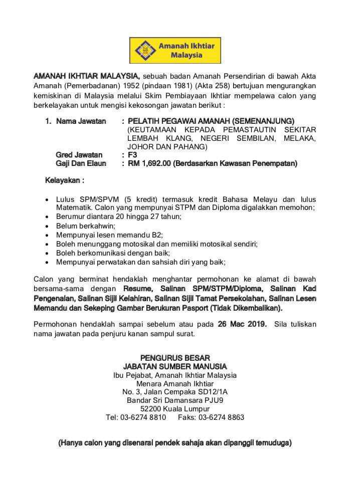 Surat permohonan jawatan kosong amanah ikhtiar malaysia. Jawatan Kosong 22 Feb 2021 - 07 Mac 2021 Info Lanjut. Permohonan Jawatan Kosong Amanah Ikhtiar Malaysia - Kelayakan PMRSPMSPMVSTPM Admin 1150 Permohonan adalah dipelawa daripada warganegara Malaysia yang berumur tidak kurang daripada 18 tahun ke atas pada tarikh tutup iklan jawatan dan berkelayakan bagi mengisi kekosongan jawatan di Amanah Ikhtiar Malaysia sebagaimaana berikut-. Pengambilan jawatan kosong ini telah dibuka kepada seluruh warganegara Malaysia yang berminat dengan jawatan kosong yang ditawarkan.
