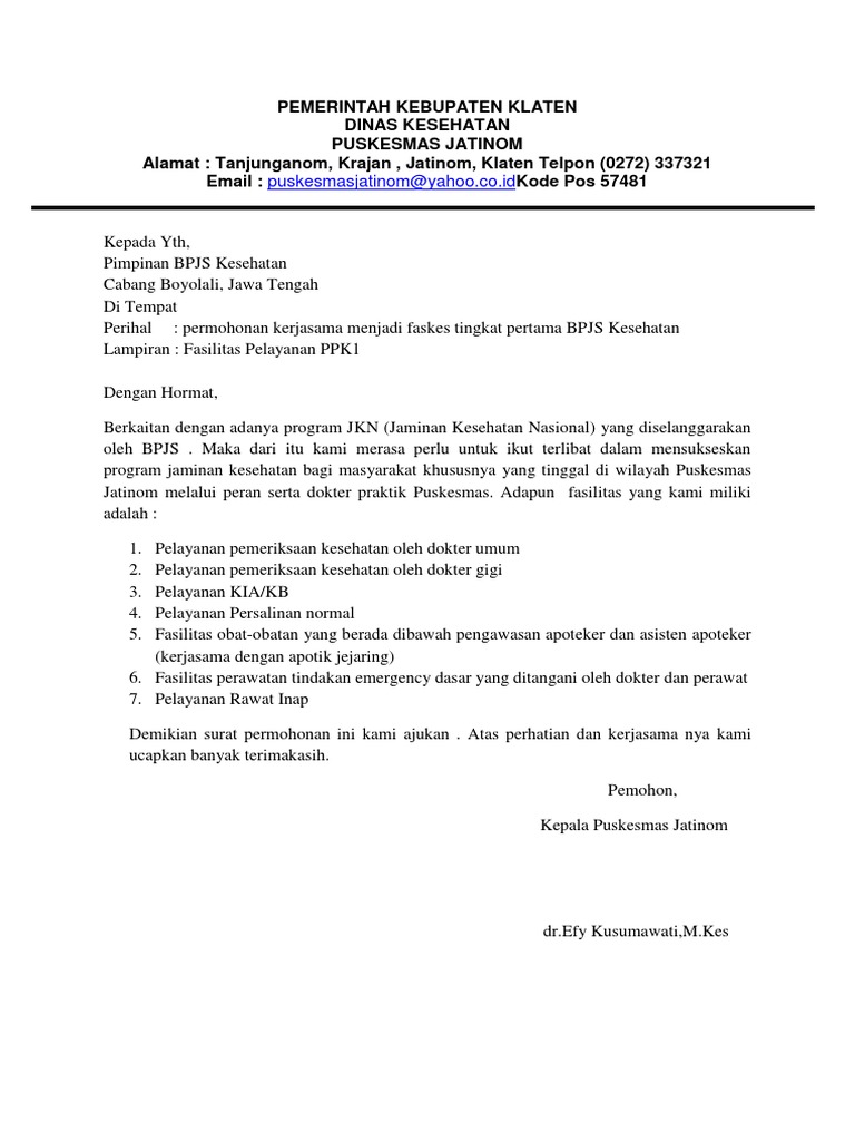 Surat permohonan kerjasama bpjs. Berikut kami bagikan contoh surat permohonan perpanjangan kontrak kerjasama dan surat kesediaan dengan BPJS kesehatan. Untuk Puskesmas atau yang setara harus memiliki. Surat permohonan kerjasama format dan contoh surat kerjasama kegiatan produk surat permohonan kerjasama merupakan sebuah surat resmi yang dibuat untuk menawarkan sebuah permintaan atau permohonan kerjasama kepada seseorang atau perusahaan agar mereka mau menerima tawaran.