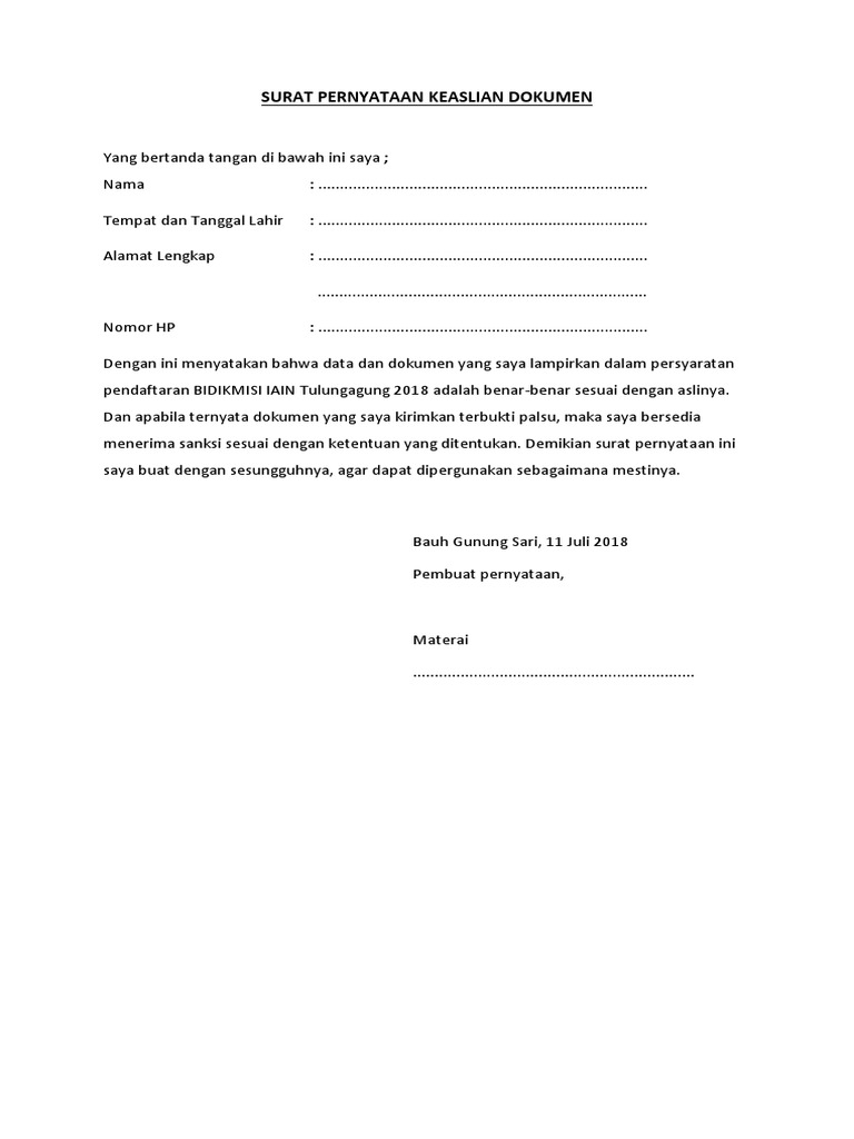 Surat pernyataan keaslian dokumen ini merupakan surat pernyataan yang menerangkan suatu dokumen yang kita sampaikan atau lampirkan merupakan asli sesuai dengan sumber dikeluarkannya dokumen tersebut. Contoh Surat Pernyataan Tanggung Jawab Mutlak untuk PPDB dapat di download pada link diatas. Ada satu jenis surat yang sangat penting yaitu surat pernyataan keaslian dokumen.