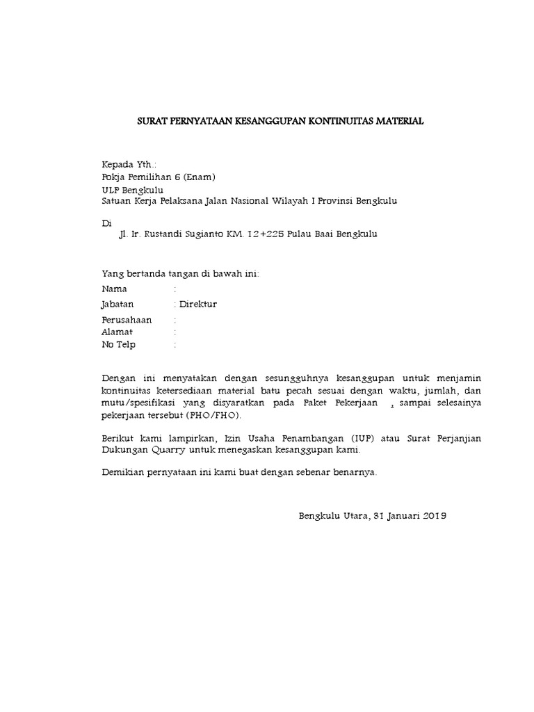 Surat Pernyataan Kesanggupan Melaksanakan Pekerjaan Doc