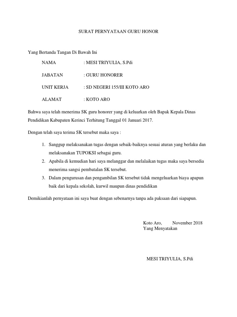 Salah satu syarat administrasi yang harus dibuat oleh guru untuk meyakinkan pemerintah bahwa guru telah melaksanakan tugas dan tanggunjawabnya adalah dengan membuat surat pernyataan bahwa telah melaksanakan tugas dan tanggunjawabnya dengan baik. 0762 91703 fax 0762 91960. Surat ini isinya menerangkan tugas dan jumlah jam mengajar seorang Guru.