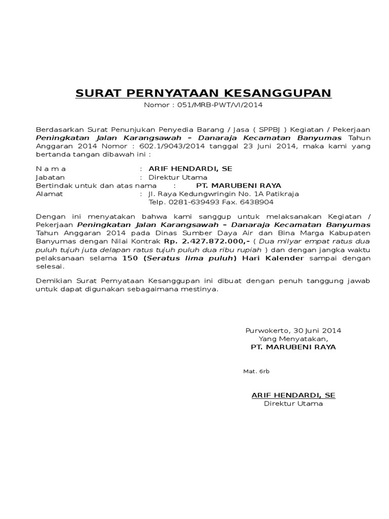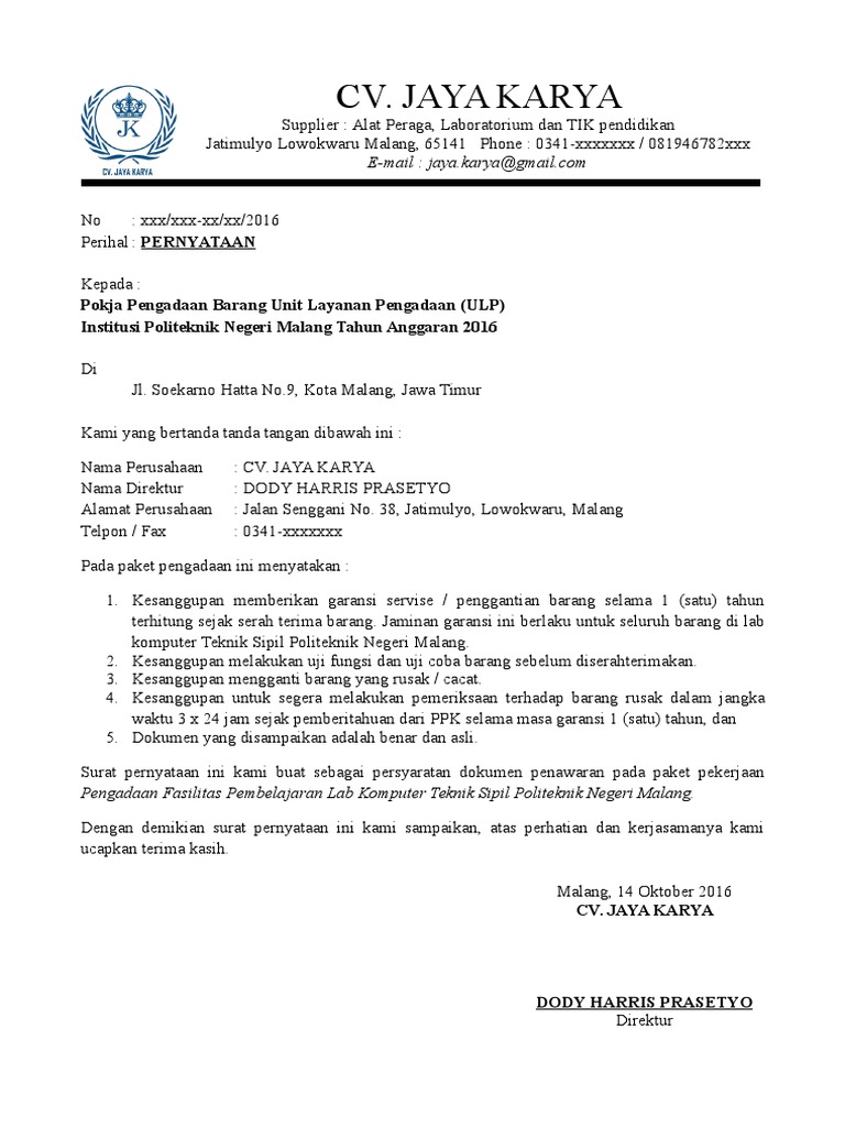 Surat pernyataan kesanggupan yang disampaikan oleh penyedia barang danatau jasa kepada Kuasa PA sebagaimana disebut di atas paling sedikit memuat. Contoh surat pernyataan kesanggupan penyedia barangjasa by kangbagi Published March 11 2020 - at dimensions 486 760 in Contoh contoh surat pernyataan kesanggupan penyedia barangjasa Images navigation. SURAT PERNYATAAN PENYEDIA BARANG DAN JASA DALAM PELAKSANAAN.